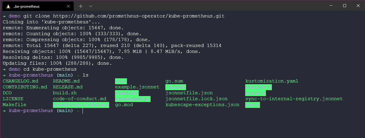 Chúng ta sẽ bắt đầu bằng cách sao chép nó vào hệ thống cục bộ của mình. Sử dụng lệnh git clone https://github.com/prometheus-operator/kube-prometheus.git và cd kube-prometheus