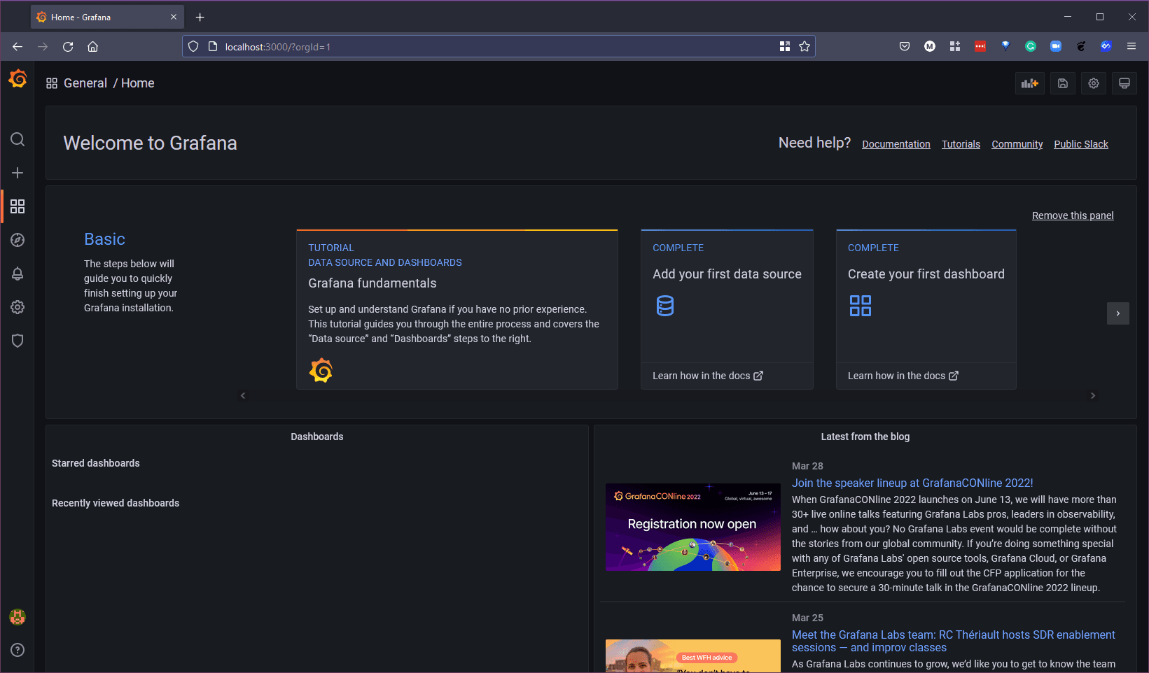 Tuy nhiên, bạn sẽ được yêu cầu cung cấp mật khẩu mới ở lần đăng nhập đầu tiên. Màn hình hoặc trang chủ mà bạn thấy sẽ có một số phần để khám phá cũng như một số tài nguyên hữu ích để có thể sử dụng Grafana và các chức năng của nó. Hãy lưu ý phần "Add your first data source" và "create your first dashboard" widgets sẽ được sử dụng ở phần sau.