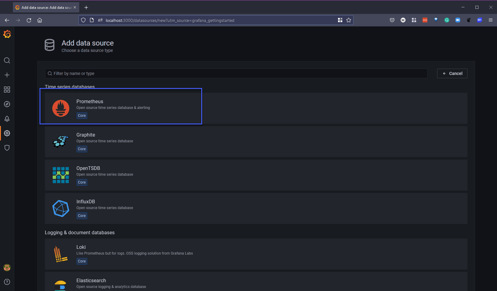 Bạn sẽ thấy rằng đã có nguồn dữ liệu Prometheus được thêm vào nguồn dữ liệu Grafana của chúng ta, tuy nhiên, vì chúng ta đang sử dụng minikube nên chúng ta cũng cần chuyển tiếp cổng cho Prometheus để nó có thể truy cập bằng localhost. Mở một terminal mới, chúng ta có thể chạy lệnh sau kubectl --namespace monitoring port-forward svc/prometheus-k8s 9090 nếu trên trang chủ của Grafana, chúng ta bắt đầu sử dụng widget "Add your first data source" và tại đây, chúng ta chon Prometheus.