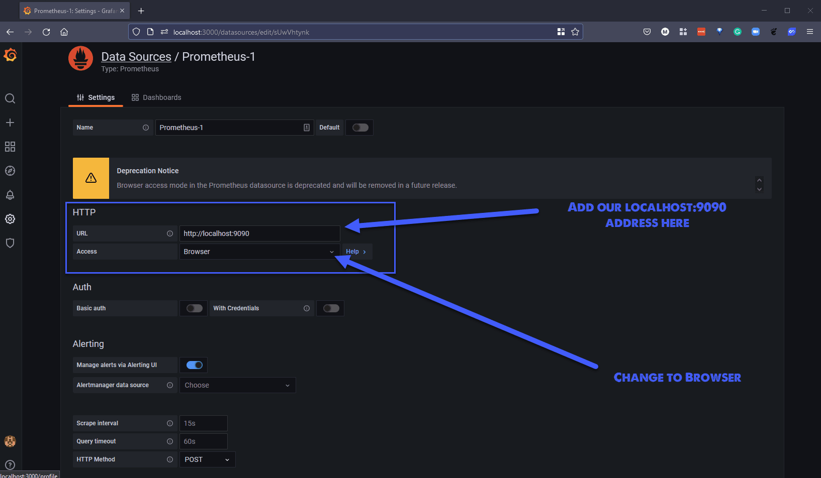 Đối với nguồn dữ liệu mới, chúng ta có thể sử dụng địa chỉ http://localhost:9090 và chúng ta cũng sẽ cần lựa chọn "Browser" như ảnh bên dưới.