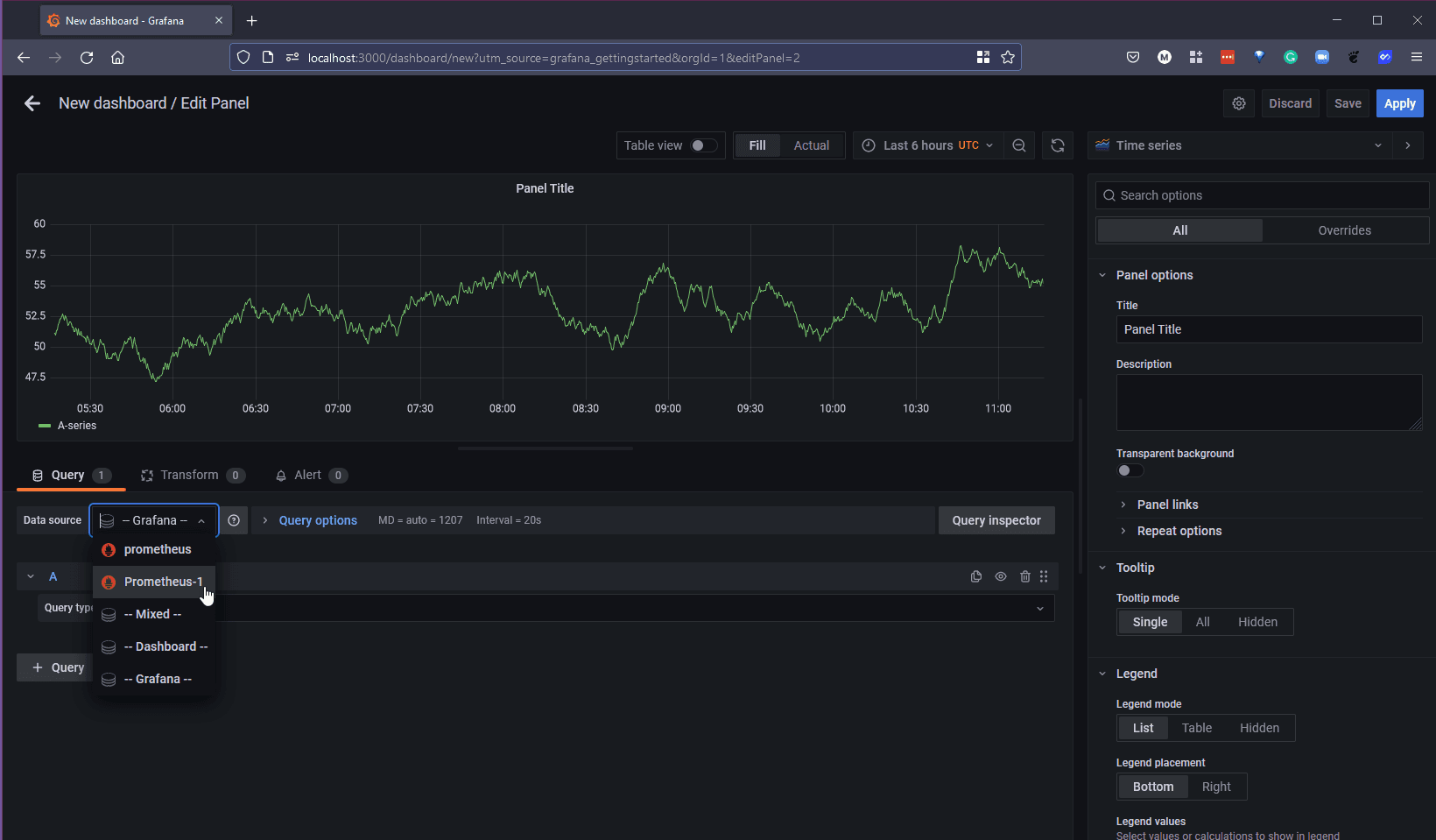 Bạn sẽ thấy You will see from below that we are already gathering from our Grafana data source, but we would like to gather metrics from our Prometheus data source, select the data source drop down and select our newly created "Prometheus-1"
