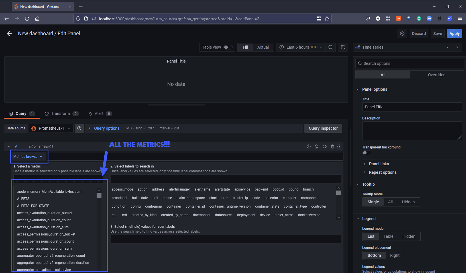 If you then select the Metrics browser you will have a long list of metrics being gathered from Prometheus related to our minikube cluster.
