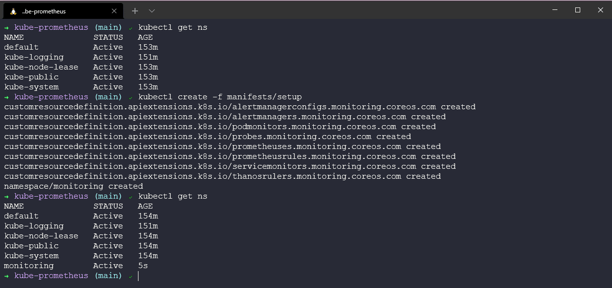 Việc đầu tiên là tạo namespace trong minikube cluster kubectl create -f manifests/setup. Nếu bạn chưa theo dõi các phần trước, chúng ta có thể sử dụng lệnh minikube start để tạo một cluster mới.