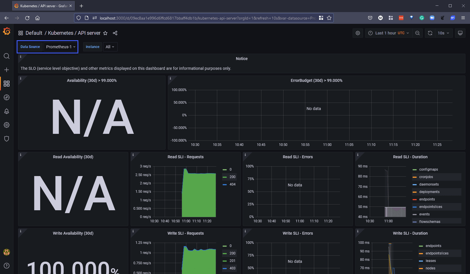 We have chosen the Kubernetes API Server dashboard and changed the data source to suit our newly added Prometheus-1 data source and we get to see some of the metrics displayed below.