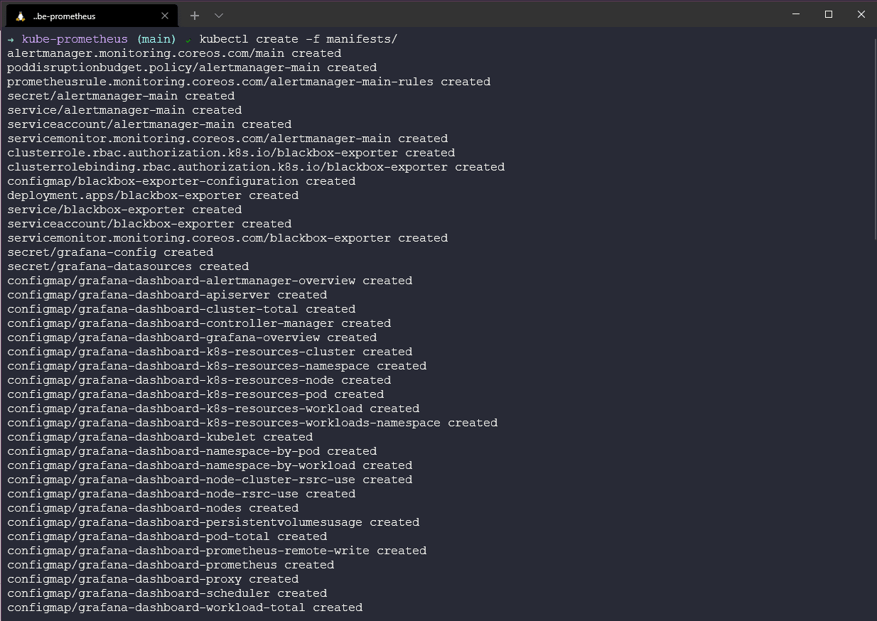 Tiếp theo, chúng ta sẽ triển khai mọi thứ chúng ta cần cho bản demo bằng lệnh kubectl create -f manifests/, bạn có thể thấy lệnh này sẽ triển khai rất nhiều tài nguyên khác trong cluster của chúng ta.