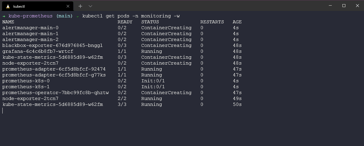 Sau đó, chúng ta cần đợi các pods của mình được khởi tạo và ở trạng thái sẵn sàng, chúng ta có thể sử dụng lệnh kubectl get pods -n monitoring -w để theo dõi các pods.