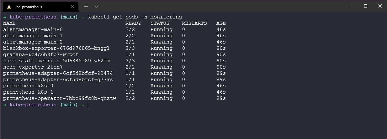 Khi mọi thứ đang chạy, chúng ta có thể kiểm tra tất cả các pods đang ở trạng thái hoạt động và hoạt động tốt bằng cách sử dụng lệnh kubectl get pods -n monitoring.
