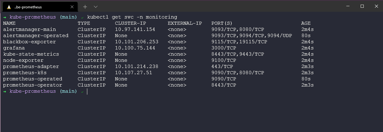 Chúng ta đã triển khai một số dịch vụ sẽ được sử dụng sau này trong demo, có thể kiểm tra bằng lệnh kubectl get svc -n monitoring.