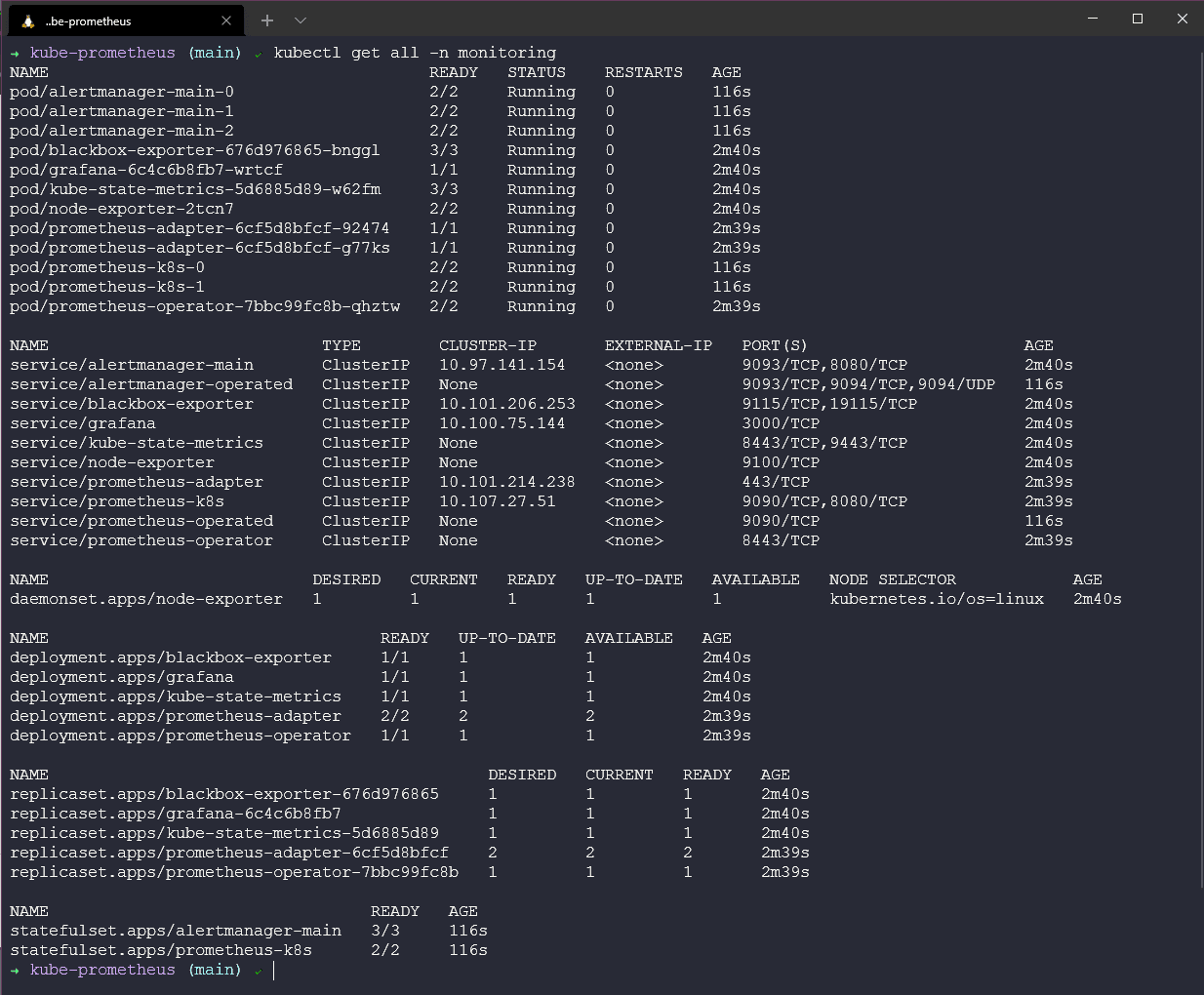 Cuối cùng, hãy kiểm tra tất cả các tài nguyên được triển khai trong namespace monitoring mới dùng cho bằng câu lệnh kubectl get all -n monitoring.
