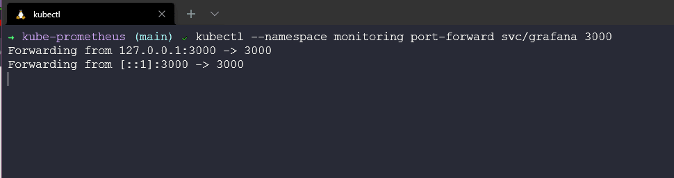 Mở một terminal mới, chúng ta hiện đã sẵn sàng cho sử dụng công cụ Grafana của mình và bắt đầu thu thập, trực quan hoá một số metrics, câu lệnh cần sử dụng là kubectl --namespace monitoring port-forward svc/grafana 3000